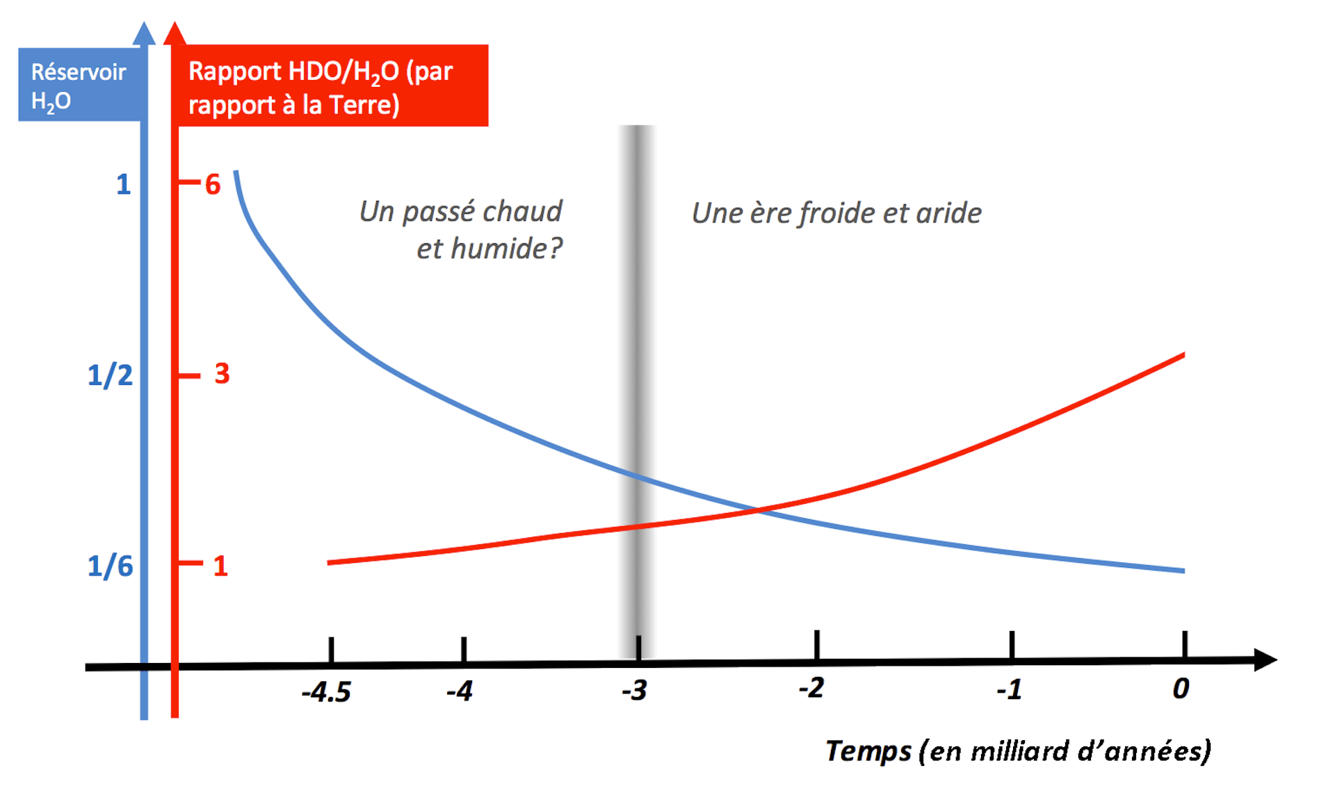 Par extrapolation, la quantité d’eau initiale sur Mars devait être au moins 6 fois plus importante que maintenant, soit l’équivalent d’une couche liquide d’une centaine de mètres recouvrant la planète. Ceci montre à quel point le rapport HDO/H20 est crucial pour se projeter dans la jeunesse de Mars et pour éclairer l’hypothèse d’un climat passé chaud et humide, préalable à son habitabilité.